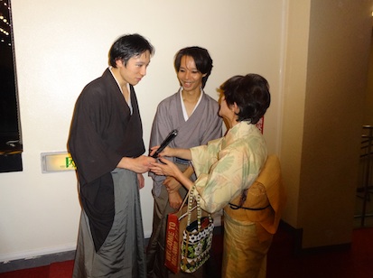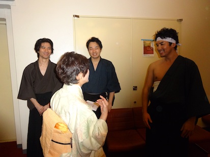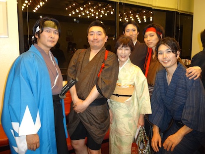 子孫として、舞台で挨拶をさせていただきました。 終了後、彦五郎の歌を作られたおふたりとご挨拶させていただきました。 作曲者の方(左)と 作詞・歌・西郷隆盛役 の潤 一郎さん(右) 公演の後、ロビーでは、キャストお見送りが行われますが、 最終公演後のお見送りは、皆さん、ホッとされたせいか、 笑顔!笑顔!でした。 役者の皆さんとの語らい。笑顔が素敵ですね。 皆さん、とてもいい顔をされていました。 近藤つね役の榊原知佳さんと。資料館にもお出でくださいました。 近藤勇役・石塚大地さんと土方歳三役・松本仁也さんに挟まれて。 演劇中に、ハプニングで、偶然にも私に飛んできた鉄扇、ひいひいおじいさん(彦五郎役の高橋さん)に返しました(笑) 彦五郎役の高橋一馬さんと。キマッテいます! ノブ役とストーリーテラーの河村由美さん。お話しも弾みました♪ 前回ノブ役で、今回はヨシ役の貫井千宏さん と 今回のノブ役・河村さん 今回も全公演3回でしたが、皆さんの熱演を観るにつけ、なにかもったいない様な気がいたします。 よりたくさんの新選組ファンの方々にも観てほしいですし、私自身もまた観たい気持ちです。 あと何回か演ってほしいですね。 |