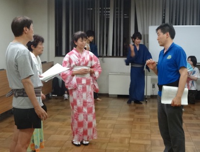 丁度、休憩時間で、6時から初の通し稽古ということでした。 照明のプロの方がお見えになり、通し稽古の意味も分からないまま始まりました、 隣りの大村氏はタイムを計っています。 「暗転!」 「役者さん板つき!」 「照明がつく、はい!」 通し稽古とは、本番と同じ、台詞を間違えようと決して止まってはいけない事だと知りました。 私、登場の2つ目の台詞で・・・全く違う台詞が出て、何とかつなげる始末。 皆さまも多少間違えながらも、初めて最後までの通し稽古は、素晴らしいものでした。 「これからどんどん良くなってくる」 「今日の台詞の間違えはどうでもいい。本番はもっと楽しくやってほしい」 演出家、大村氏の言葉に励まされました。 明日も稽古です。 |