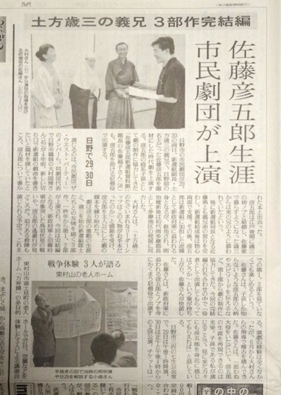 8月28日の読売新聞多摩版に掲載されました。 今回の物語は 「慶応4年1月。鳥羽伏見の戦いで明治政府軍との戦いに破れた新選組は崩壊し、副長土方歳三は新天地、箱館を目指す。そして、その身を案じる日野宿名主、佐藤彦五郎自身にも追ってが迫っていく・・・!」 という内容です。 彦五郎、ノブ、佐藤俊宣、土方歳三、近藤勇、井上源三郎、島田魁、野村利三郎、相馬主計、安富才助、市村鉄之助、笹間金八郎、榎本武揚、甲賀源吾、大塚波次郎、板垣退助、山地忠七、谷神兵衛、大和屋友次郎、凪、いさり、よいそ、りん 等が、多摩、箱館のシーンを彩ります。 稽古に参加し共に作っていきながら、皆さんのそのひた向きな姿勢に感激しています。 是非、たくさんの皆さんに観てほしい演劇です。 会場:七生公会堂(京王線高幡不動駅から徒歩約8分) 8/29(土)18:30開場、19:00開演 8/30(日)11:30開場、12:00開演 15:30開場、16:00開演 チケット:1980円(中学生・高校生1000円/小学生以下無料) チケット・お問合せ・・・代表 大村:090-7813-8261 |