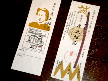 今回は、講演会のテーマが「土方歳三と小島家」ということで 歳三の愛刀、葵御紋が刻印されている「越前康継」を モチーフにしました。 彦五郎忌のチケット(右が表面、左が裏面) 記念品(挨拶状、刀の鍔の写真、手ぬぐい) 「越前康継」のオリジナル手ぬぐい この手ぬぐいは、当資料館でも、販売いたします。 挨拶状の内容は、下記の通り、載せておきます。 第九回 彦五郎忌 此の度は、「彦五郎忌」にご参加頂き、誠に有難うござい ます。 早いもので、今回で第九回目となりましたが、土方歳三た 沖田総司のような、名の知られた新選組隊士でもなく、表舞 台に立っていなかった彦五郎を、偲んでいただけることに、 感謝申し上げます。 私は、歳三が敬い尊んだ「彦五郎」と、歳三が慕ってやま なかった「のぶ」との直系の子孫であることを、誇りに思っ ております。 これからも、彦五郎、そして、佐藤彦五郎新選組資料館を あたたかく見守って頂けます様、一所懸命努力して参ります。 そして、彦五郎忌が長く続いてゆくことを、願っておりま す。 今日のことが、少しでも皆様の心に残る催しでありました ら、幸いでございます。 平成廿四年 九月九日 佐藤 福子 PR |