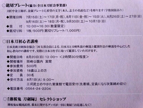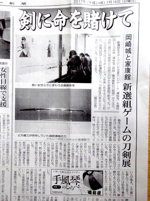 薄桜鬼・刀剣展、9時オープニングのため、20分前に会場の家康館に到着しました。 すると、暑い日差しの中、ファンの女子が並んでおられ、お気の毒のよう....関係者の方々も熱中症の心配もしておられました。 展示会場は3つあり、特別展示室に近藤勇、土方歳三、沖田総司、斎藤一、坂本龍馬等の所縁の刀や品が展示されています。 1階展示室には、高杉晋作、吉田松陰等。 第3会場は岡崎城2階展示室で、永倉新八、原田左之助、藤堂平助等になっています。 CBCテレビと東海愛知新聞の取材を受けました。 (東海愛知新聞 7月16日付) 刀剣女子の皆さんは、じっくり刀を鑑賞されており、薄桜鬼ファンの方々は、グッズ・コーナーで興奮されておりました。 また有名刀匠の先生方の作による小刀、ペーパーナイフの販売もありました。 長船鍛錬場からお出での刀匠・川島氏による「銘切」は、行列となっておりました。 (銘切の様子です) 開催日は下の画像 PR |