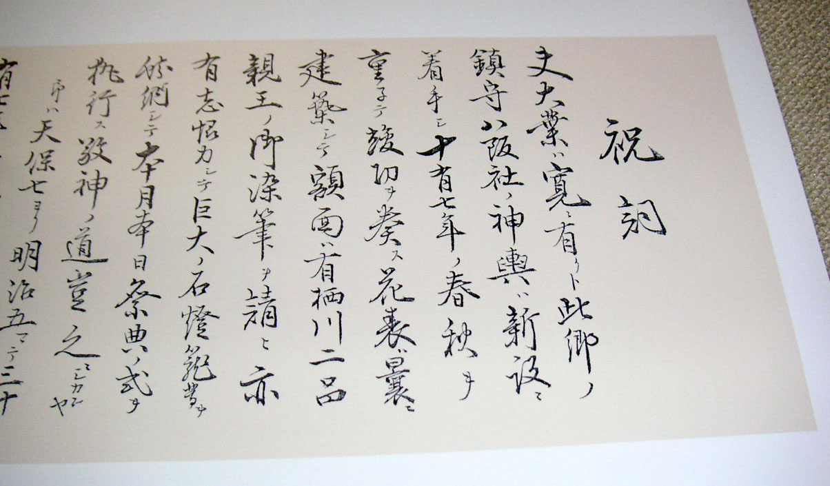 日々、時間を作って佐藤家に代々伝わる古文書類を調査しておりました処、日野の八坂神社の神輿等の再建された際に納められた佐藤俊正(彦五郎)がしたためた祝詞の写しが出てまいりました。