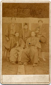 それによりますと『身の丈が五尺六寸余り』ということでした。 五尺六寸は現在のメートル法でいうと、 『約169cm』 余りがついているので、170cmくらいかも知れません。 これには一寸ビックリいたしました。 それは、以前、どなたかに 「彦五郎さんはそんなに背は高くなかったんだよ」 と伺ったことがあり、 それに拠って、155cmくらいと思い込んでおりました。 また、高下駄を履いた彦五郎肖像写真の印象も、小柄な感じだったからです。 しかし、そうではなかったということです。 さらに身長を記した文書に加えて、区長を務めていた頃の彦五郎の写真を見つけました。 区長たちの集合写真で、明治初期のものです。 それを見ると、その中でも背が高いほうでした。 これで、彦五郎があの長い太刀を愛用していた所以にも、合点がいきます。 歳三が167cmくらいと云われておりますので 2〜3cm程高いということになります。 また近藤勇は170cm前後という話しです。 もしそうだとすると、彦五郎と同じくらいだったのでしょう。 私の中での彦五郎のイメージが少し変わってきました。 だって、思っていたより15cm程、背が高かったのですから。 |